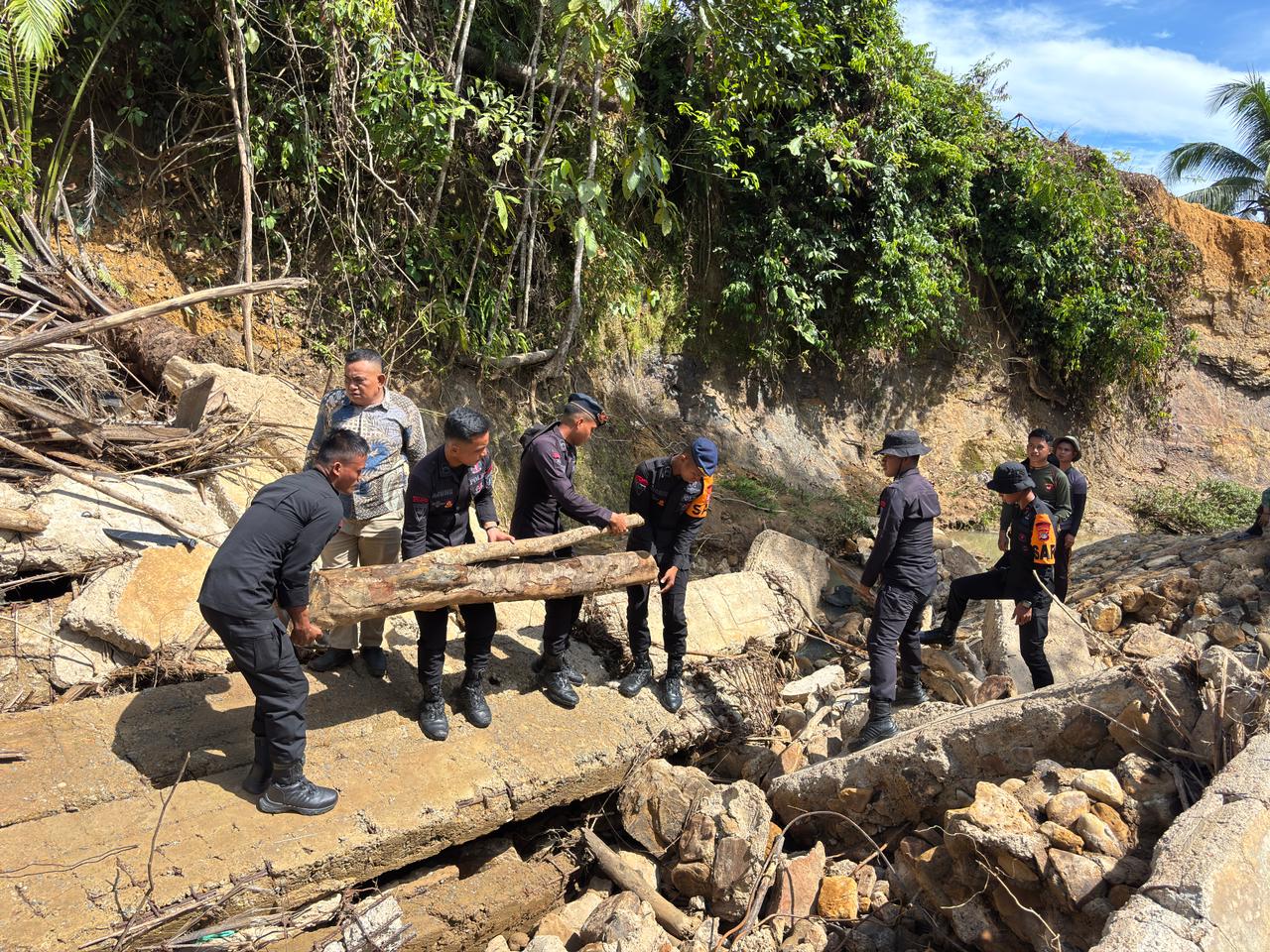 Sebagai bentuk kepedulian terhadap keselamatan dan kelancaran aktivitas masyarakat, Tim Perbaikan Jembatan Kompi 2 Batalyon B Pelopor secara sigap dan penuh semangat bersama masyarakat sekitar melaksanakan pembangunan kembali jembatan tersebut dengan semangat gotong royong.