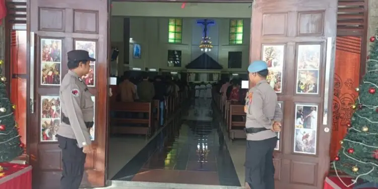 TANJUNG SELOR – Jajaran Polresta Bulungan melaksanakan pengamanan ketat dalam rangka perayaan ibadah Natal di Gereja Paroki Santa Maria Assumpta Katedral, Jalan Skip 1, Tanjung Selor, pada Kamis (25/12/2025).